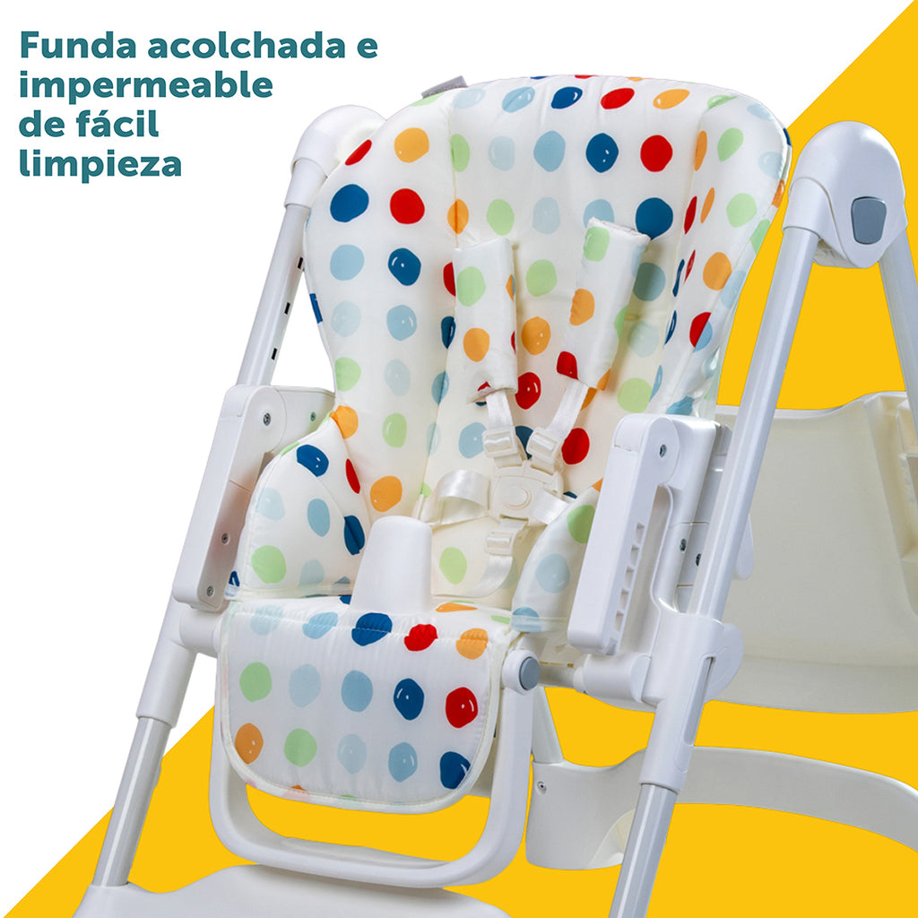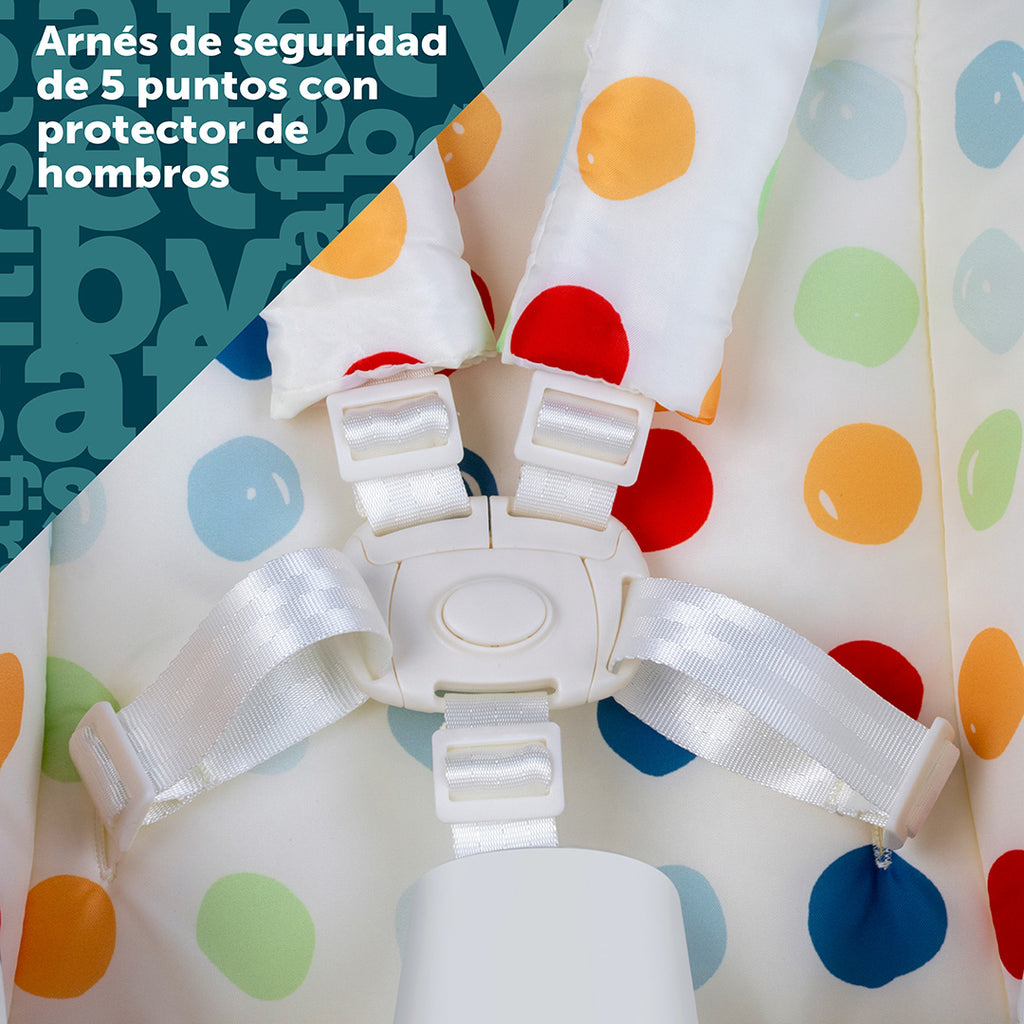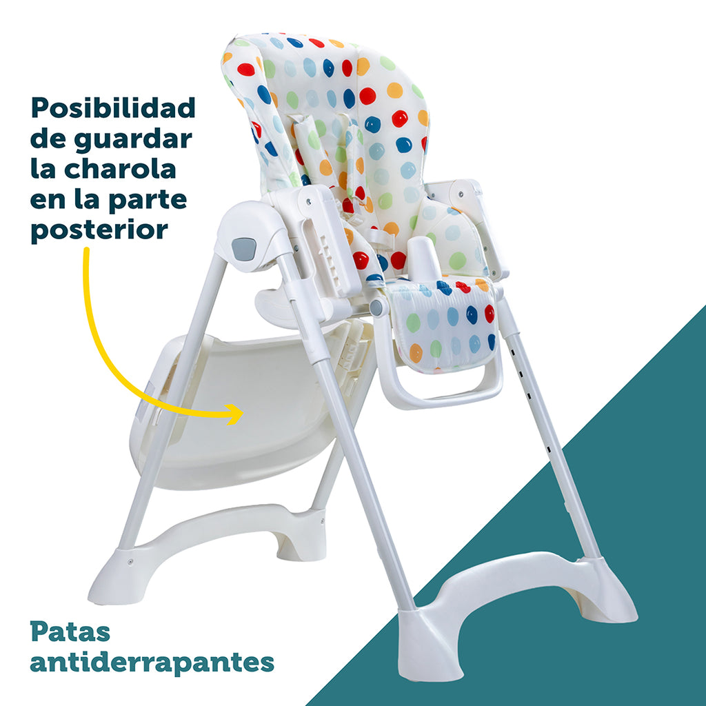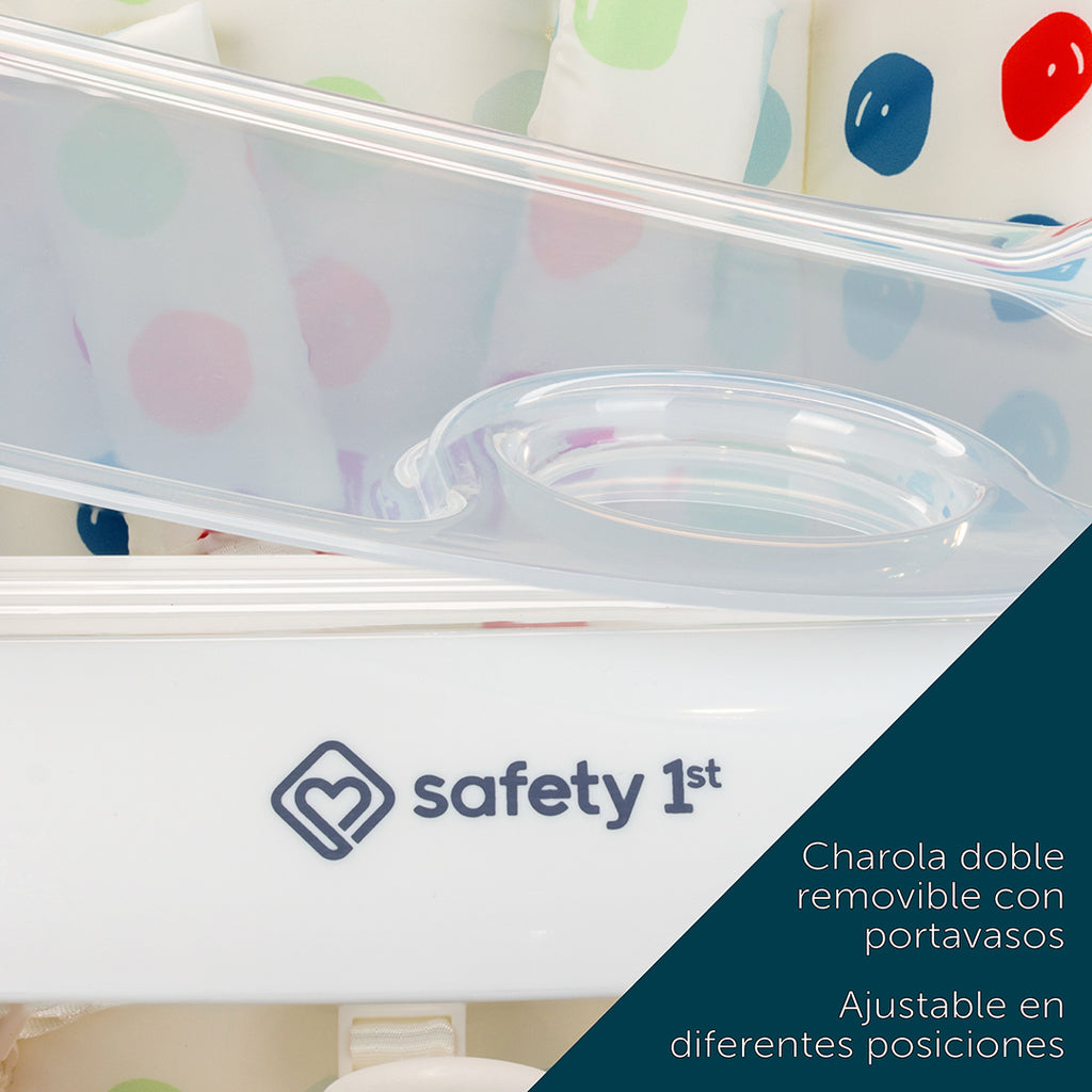También podrás elegir entre 3 posiciones de reclinación y múltiples posiciones del reposapiés ajustable. Además, su funda acolchada y colorida ayudará a que tu bebé disfrute siempre de la hora de la comida. Cuenta con arnés de seguridad de 5 puntos y patas antiderrapantes para que esté siempre seguro y tú tranquila. La charola doble es ajustable y cuenta con práctico portavasos para colocar sus bebidas o snacks. Su limpieza es muy sencilla ya que la funda es impermeable y removible, así como su charola.