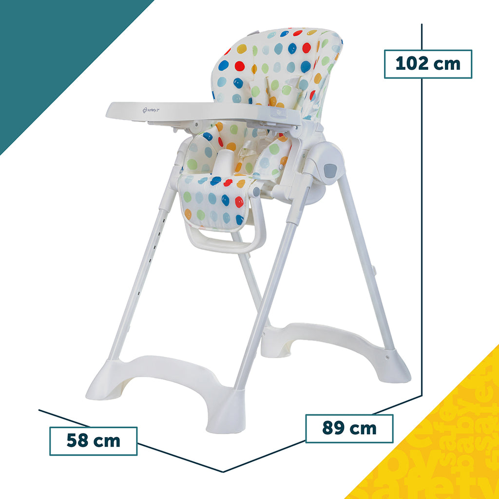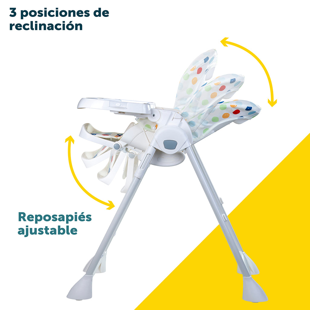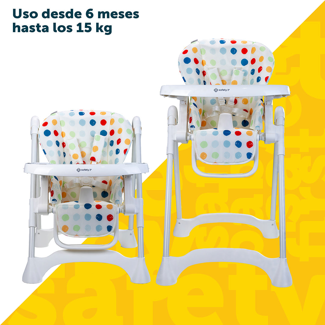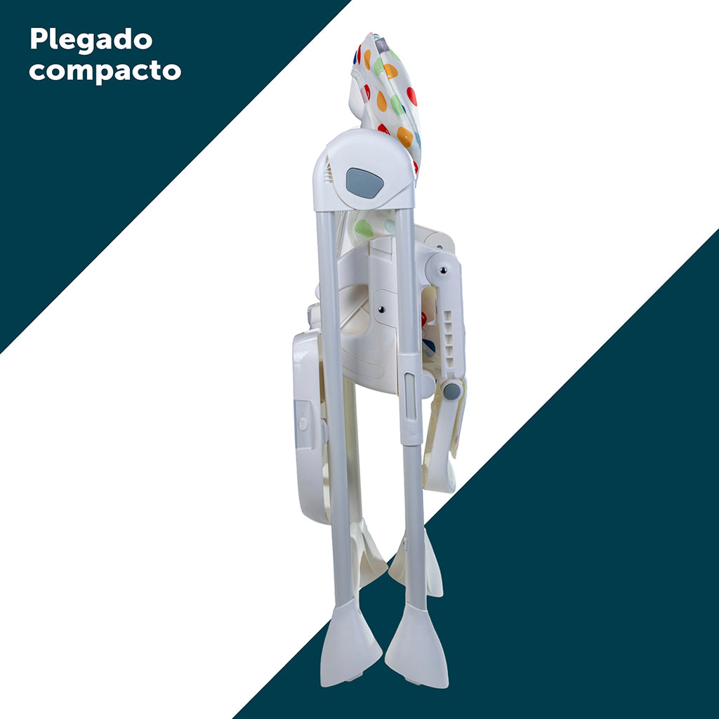También podrás elegir entre 3 posiciones de reclinación y múltiples posiciones del reposapiés ajustable. Además, su funda acolchada y colorida ayudará a que tu bebé disfrute siempre de la hora de la comida. Cuenta con arnés de seguridad de 5 puntos y patas antiderrapantes para que esté siempre seguro y tú tranquila. La charola doble es ajustable y cuenta con práctico portavasos para colocar sus bebidas o snacks. Su limpieza es muy sencilla ya que la funda es impermeable y removible, así como su charola.