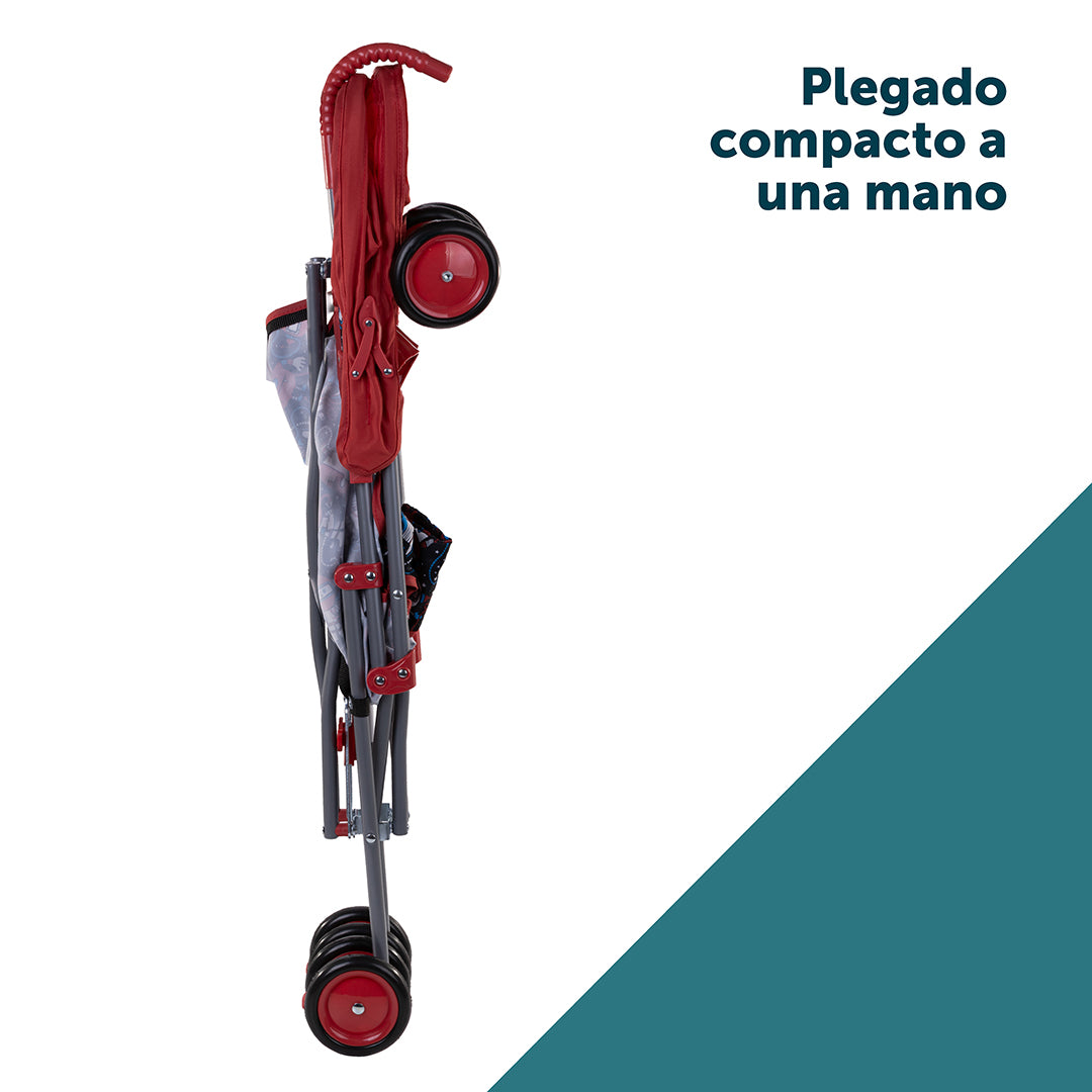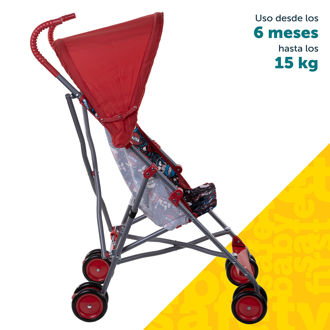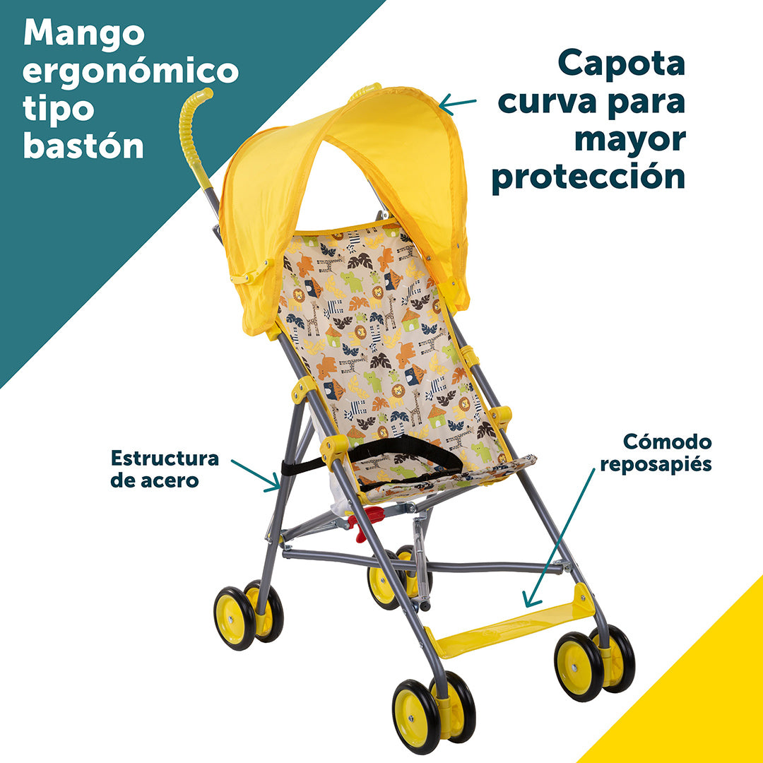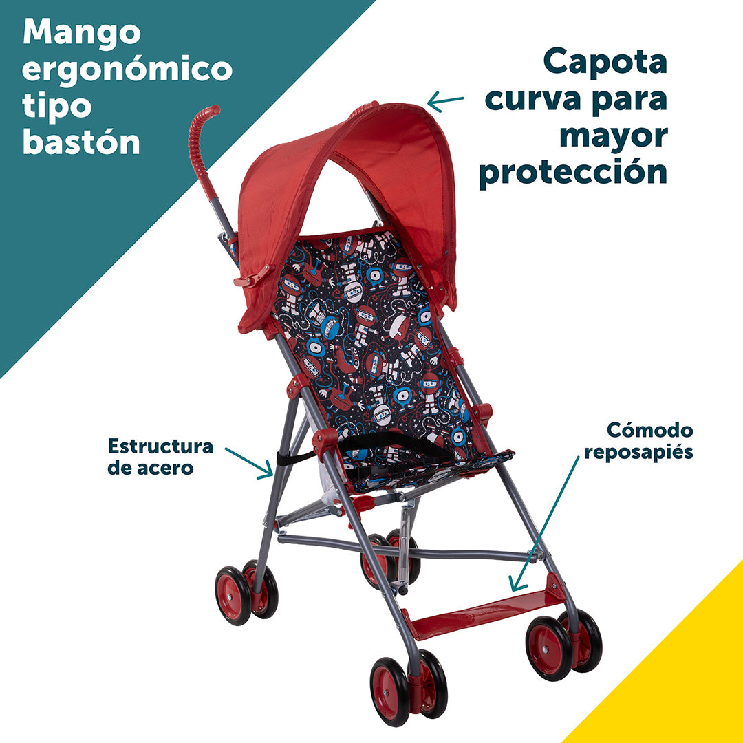 • Diseño.- Mango ergonómico tipo bastón, estampados divertidos, capota curva para mayor protección y cómodo reposapiés.