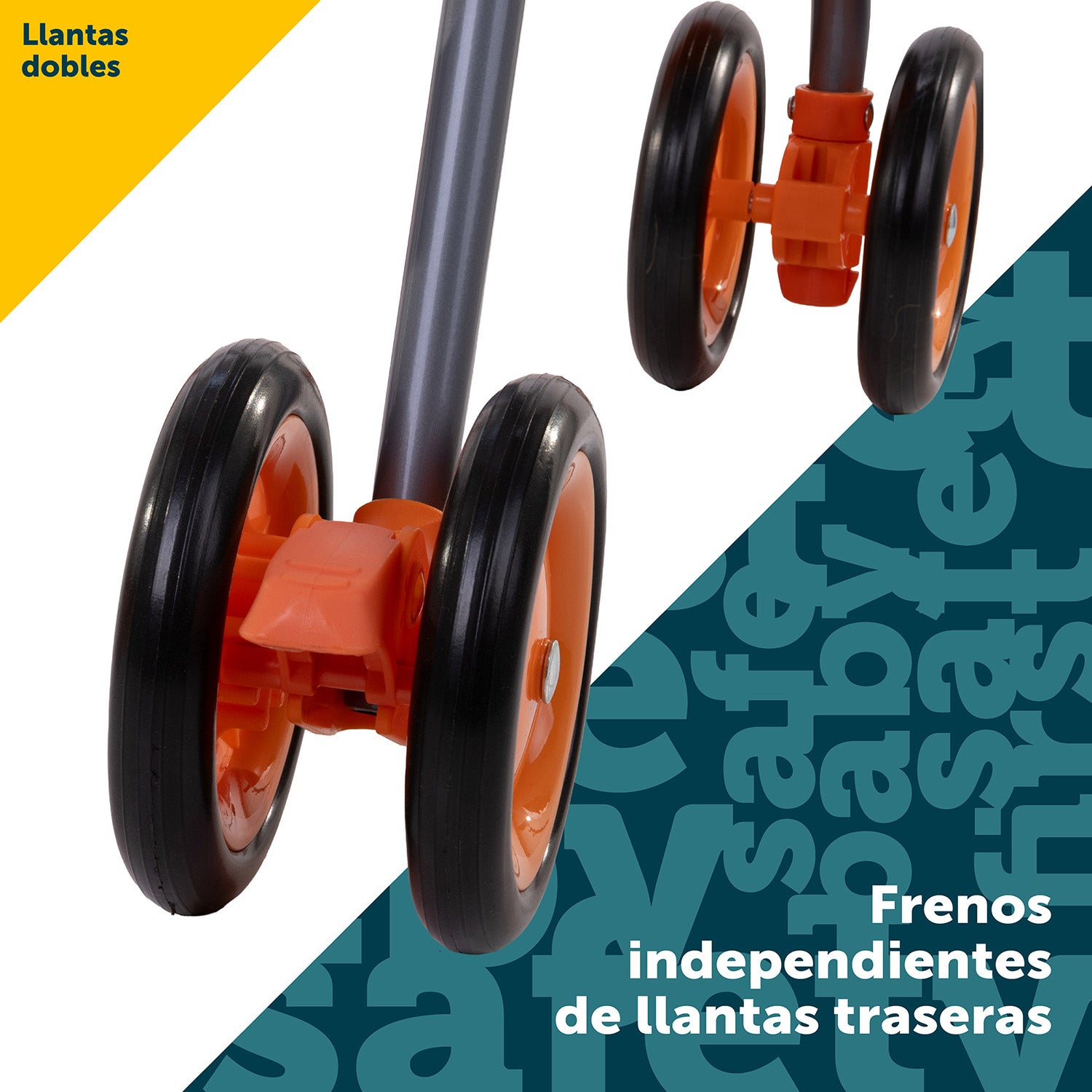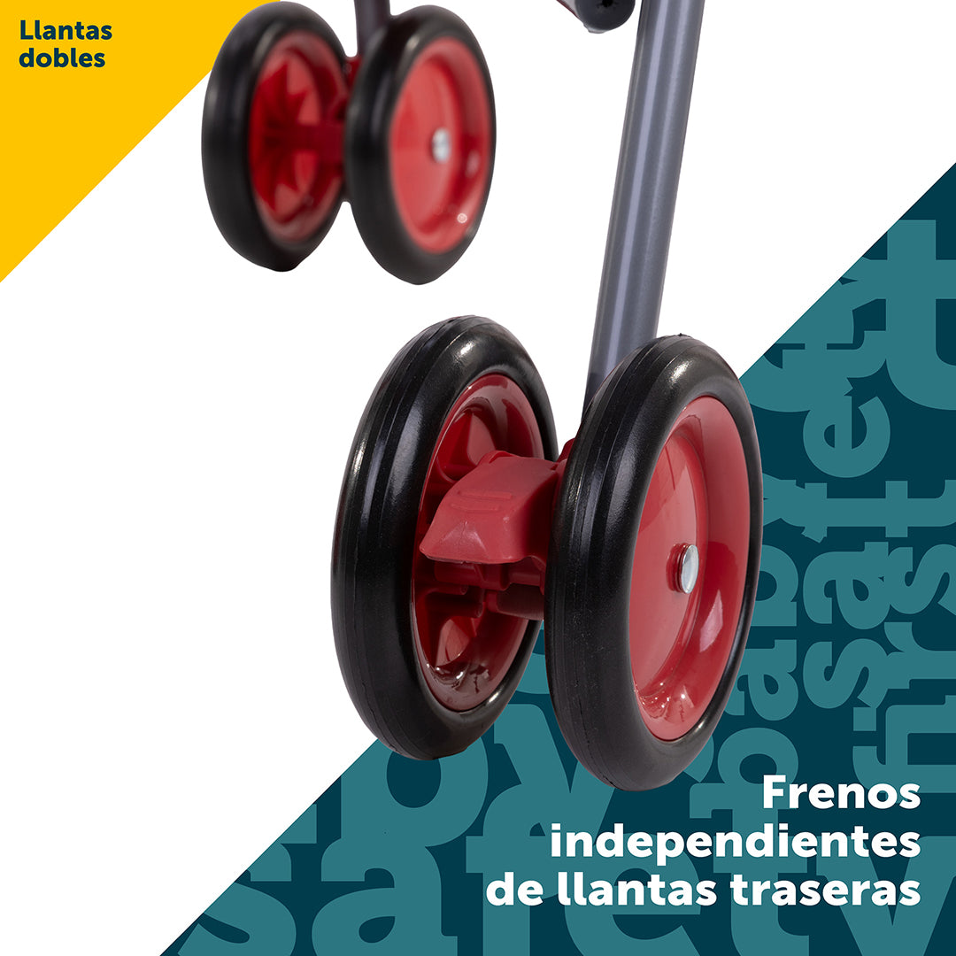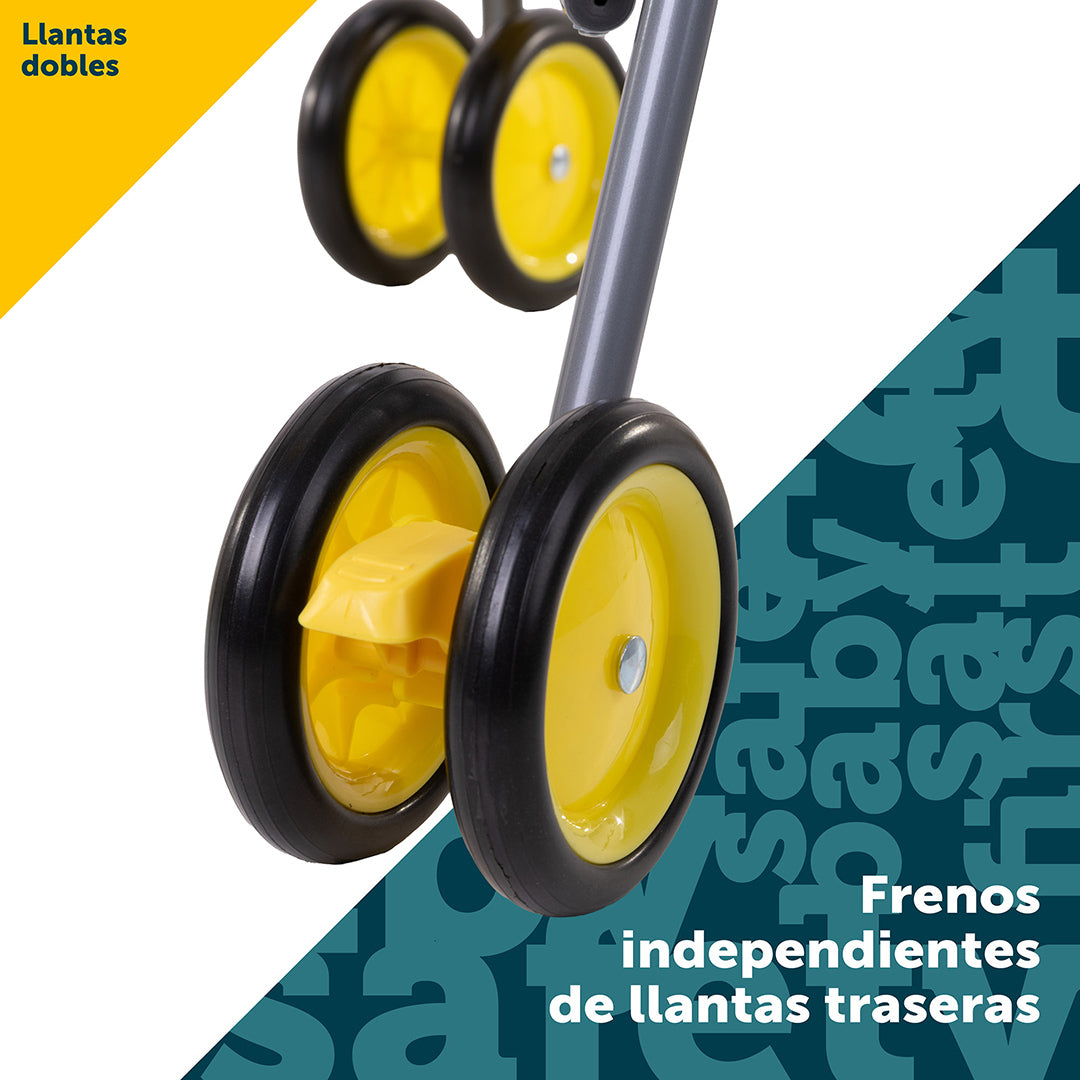 Es cómoda, con un reposapiés confortable y una capota curva que ofrece mayor cobertura en exteriores. Su plegado compacto a una mano la hace ideal para espacios reducidos y para llevar a todos lados. Además, sus llantas dobles delanteras y frenos independientes en las traseras te darán una excelente maniobrabilidad.