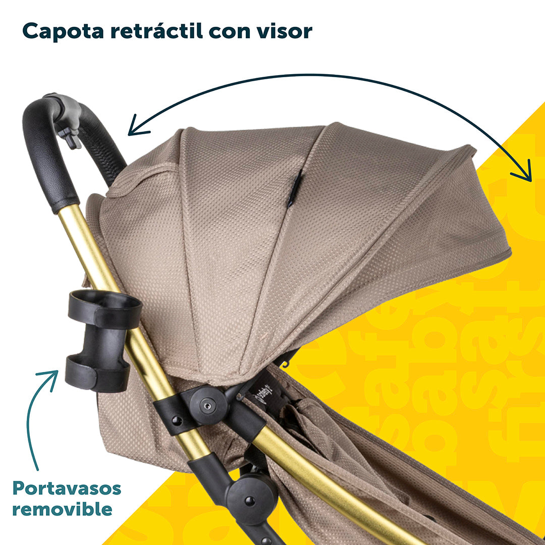La capota extendible con visor protege a tu bebé del sol y el viento, mientras que la barra frontal removible ofrece un extra de seguridad y practicidad.