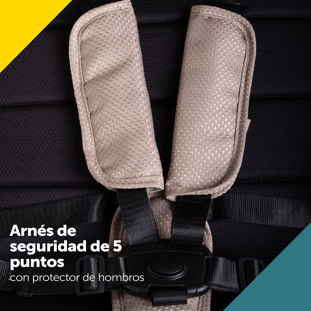 Viajará cómodo gracias a su respaldo y reposapiés ajustables, además de un acolchado premium para que disfrute de sus salidas. En cuanto a seguridad no tendrás preocupaciones ya que cuenta con arnés de 5 puntos y doble freno para brindarte tranquilidad en cada paseo.